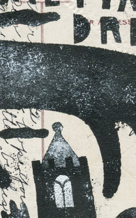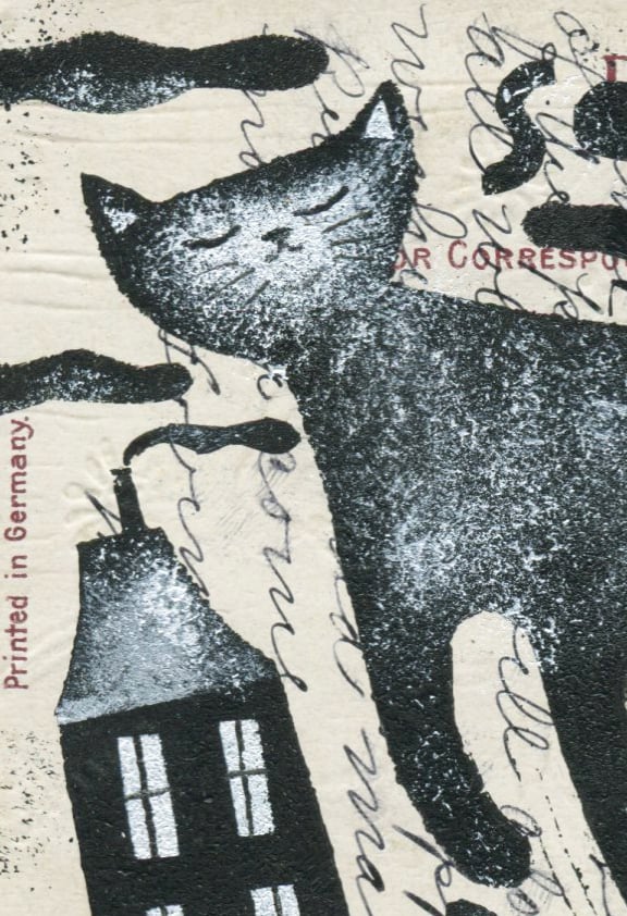 Original art was stencilled on reverse of vintage postcard
